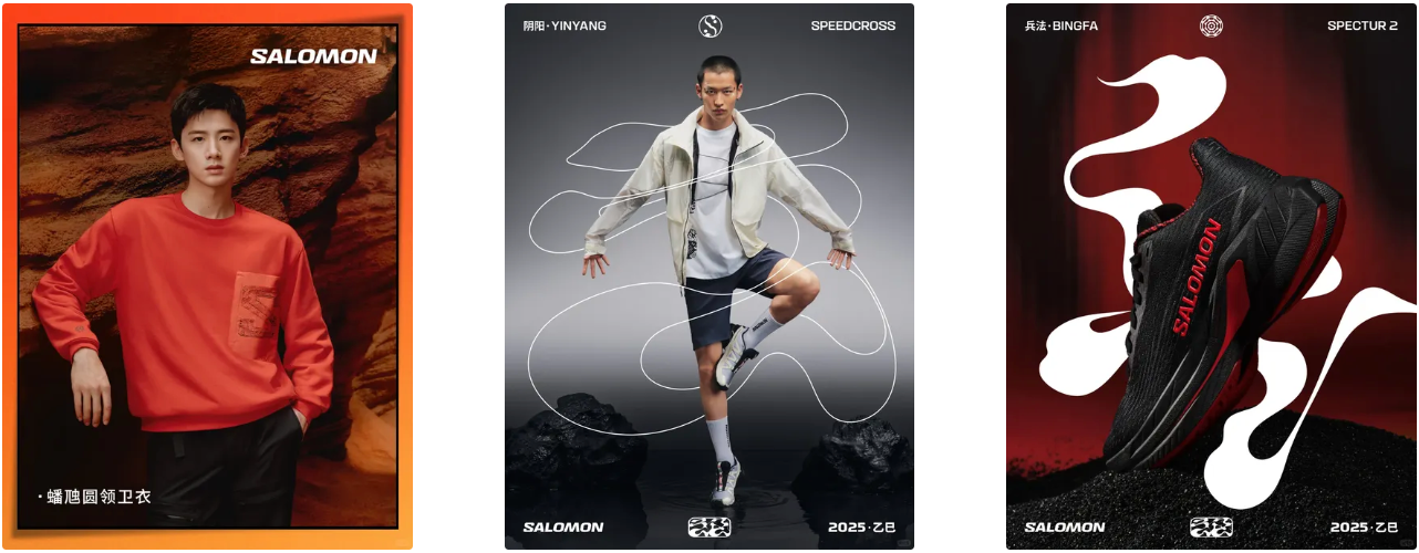 フランスのアウトドアブランド Salomon(親会社の Amer Sports は 2019 年に中国・安踏が買収)は、2025年の春節に「盘槐模様」から着想を得た中国文化シリーズ《乙巳(Yi Si)》を発表しました。伝統的な意匠と「山の道(Tao of the Mountains)」というブランド哲学を組み合わせたシリーズです。ブランドは俳優の白敬亭をはじめ、中国のアウトドア愛好家たちを起用したショートフィルムを制作し、「自然の道」と「心の修行」が重なり合う世界観を表現しました。
