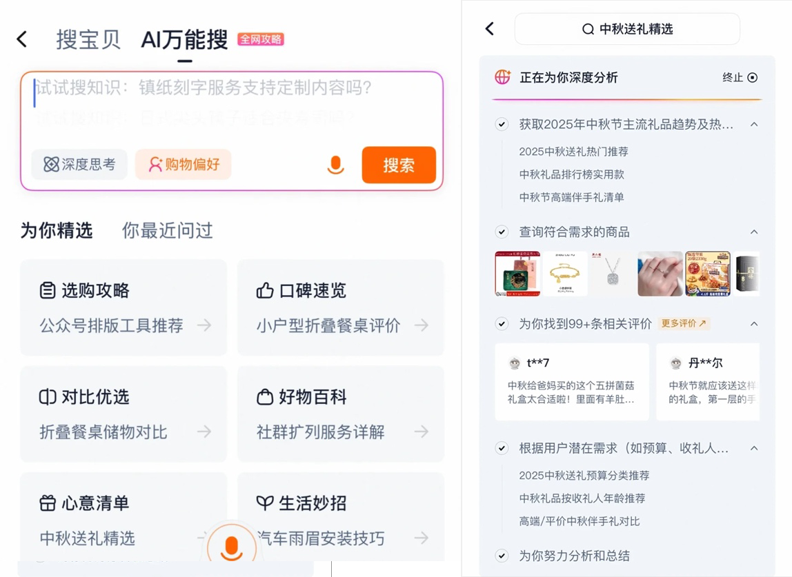 「AI万能搜」は、わずか数秒で全体のショッピングプランを提示してくれるAIアシスタントです。商品の価格、おすすめ理由、購入リンクを一覧で示すだけでなく、さらに質問したり再検索したりすることも可能です。つまり、従来のAI検索に商品リンクを統合することで、検索 → 選定 → 購入までの一連のプロセスをワンクリックで完了できる便利ツールになっています。