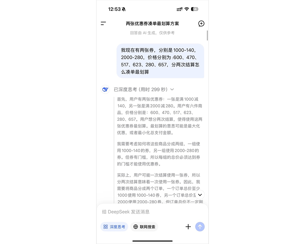 Deepseekは、優秀な「買い合わせ計算」アシスタントです。商品リストや割引クーポンなどを入力するだけで、最もお得な買い方の組み合わせを自動算出してくれます。どの商品をどう組み合わせれば最も安く買えるか、AIが具体的にアドバイスしてくれるので、節約志向の消費者には欠かせません。
