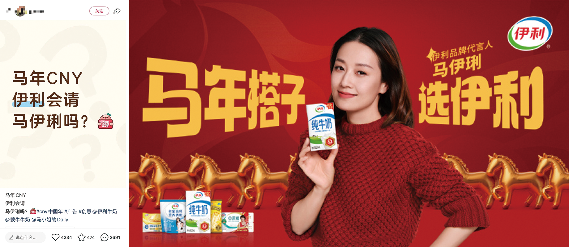 右:伊利公式アカウントは馬伊利を起用すると発表。画像出典:伊利ウェイボー公式アカウント
