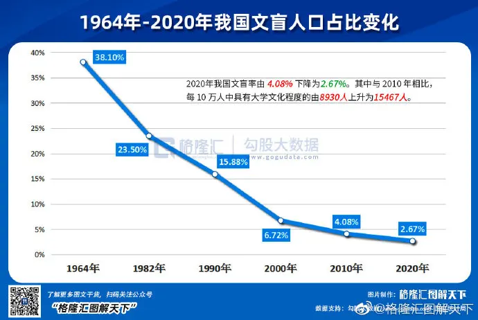 大学教育を受けた人は2億1836万人。 2010年と比較して、人口10万人あたりの大学教育を受けた人の数は8,930人から15,467人に増加し、15歳以上の人の平均学校教育年数は9.08年から9.91年に増加し、識字率は4.08%から2.67%に低下しました。