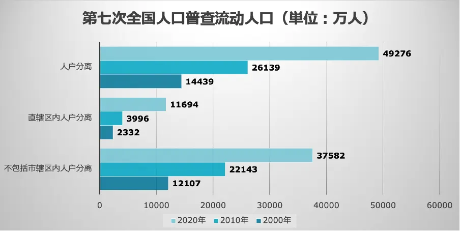 世帯分離人口は4億9,276万人で、そのうち1億1,694万人が市区町村内での分離であり、移動人口は3億7,582万人で、そのうち1億2,484万人が省を越えて移動している。 2010年と比較して、世帯分離者数は88.52%増、市レベル管轄内の世帯分離者数は192.66%増、移動人口は69.73%増となりました。