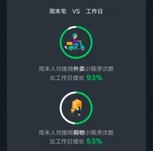 普段仕事が忙しい人は週末あまり外に出かけたいと思いません。このように考える人は1200万人います。そのため、週末はデリバリーミニプログラムの利用者が営業日より93%増加し、ECミニプログラムの利用者は53%を増えます。